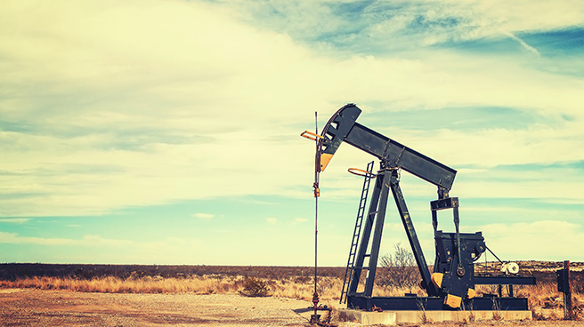 Oil rigs drill on land to get oil from deep underground.