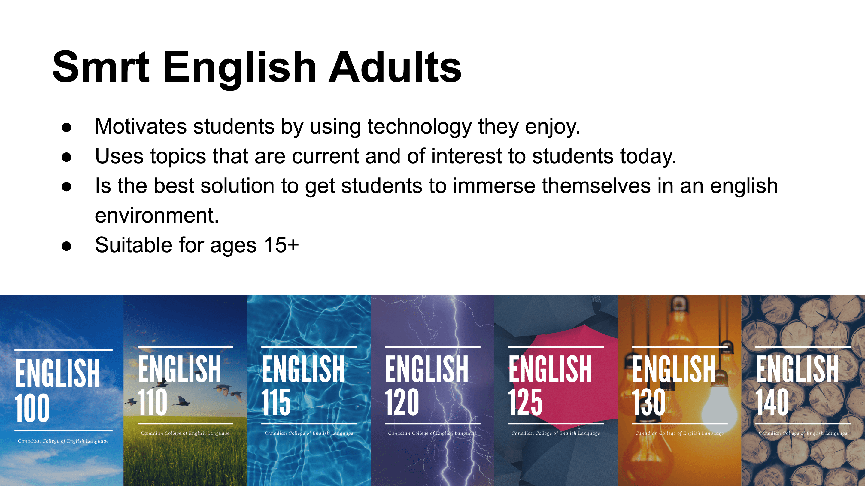 Most users begin with Core Courses for adult learners and progress to Electives, English for Special/ Specific Purposes, as well as Academics, and Test Preparation courses